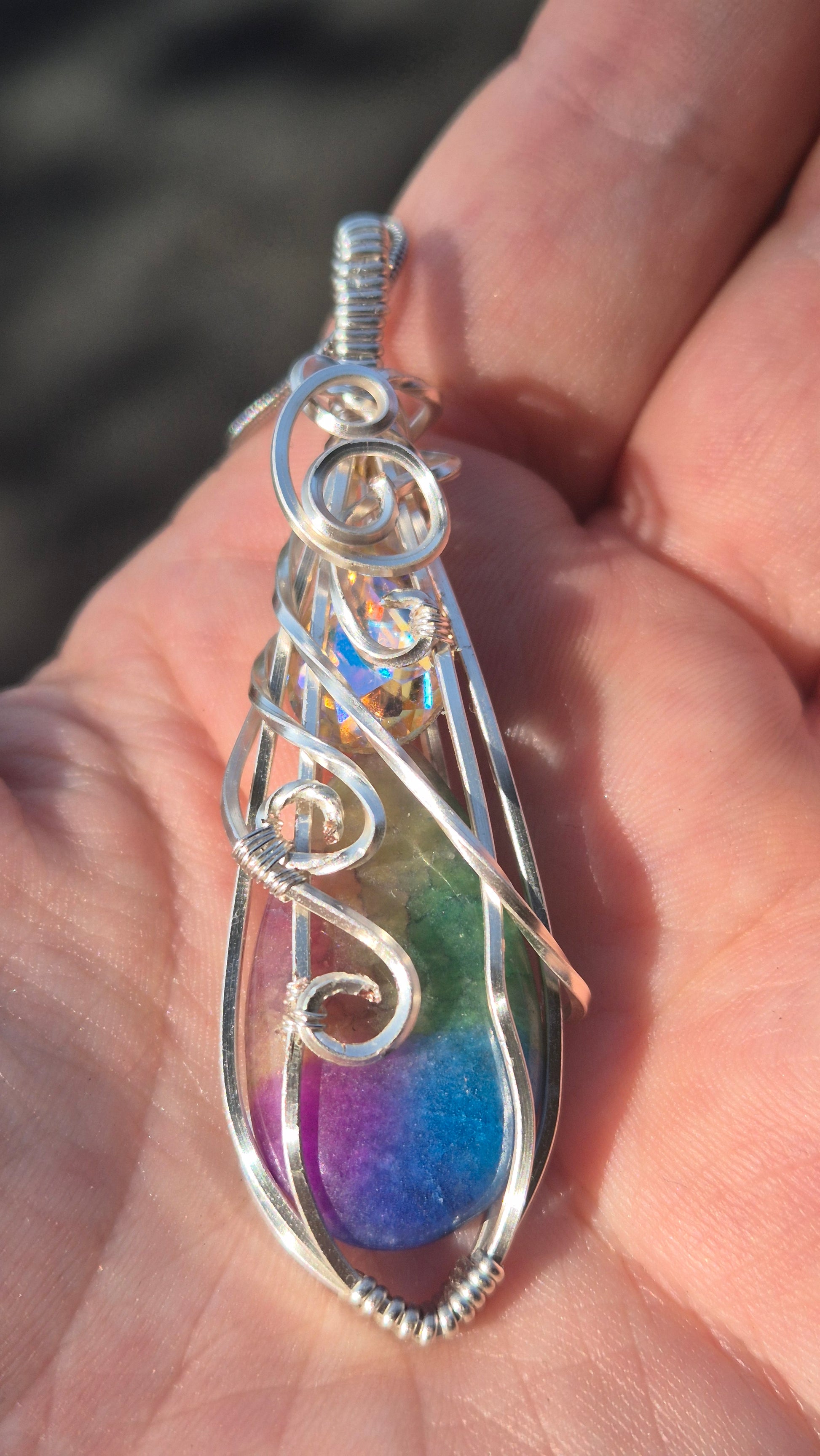 Carry the vibrant energy of the rainbow with this one-of-a-kind solar quartz pendant. Hand-wrapped in intricate silver-plated wire, the design flows in graceful swirls that frame a stunning, multi-hued solar quartz slice. A sparkling aurea crystal bead nestles above the stone, catching the light with every movement.