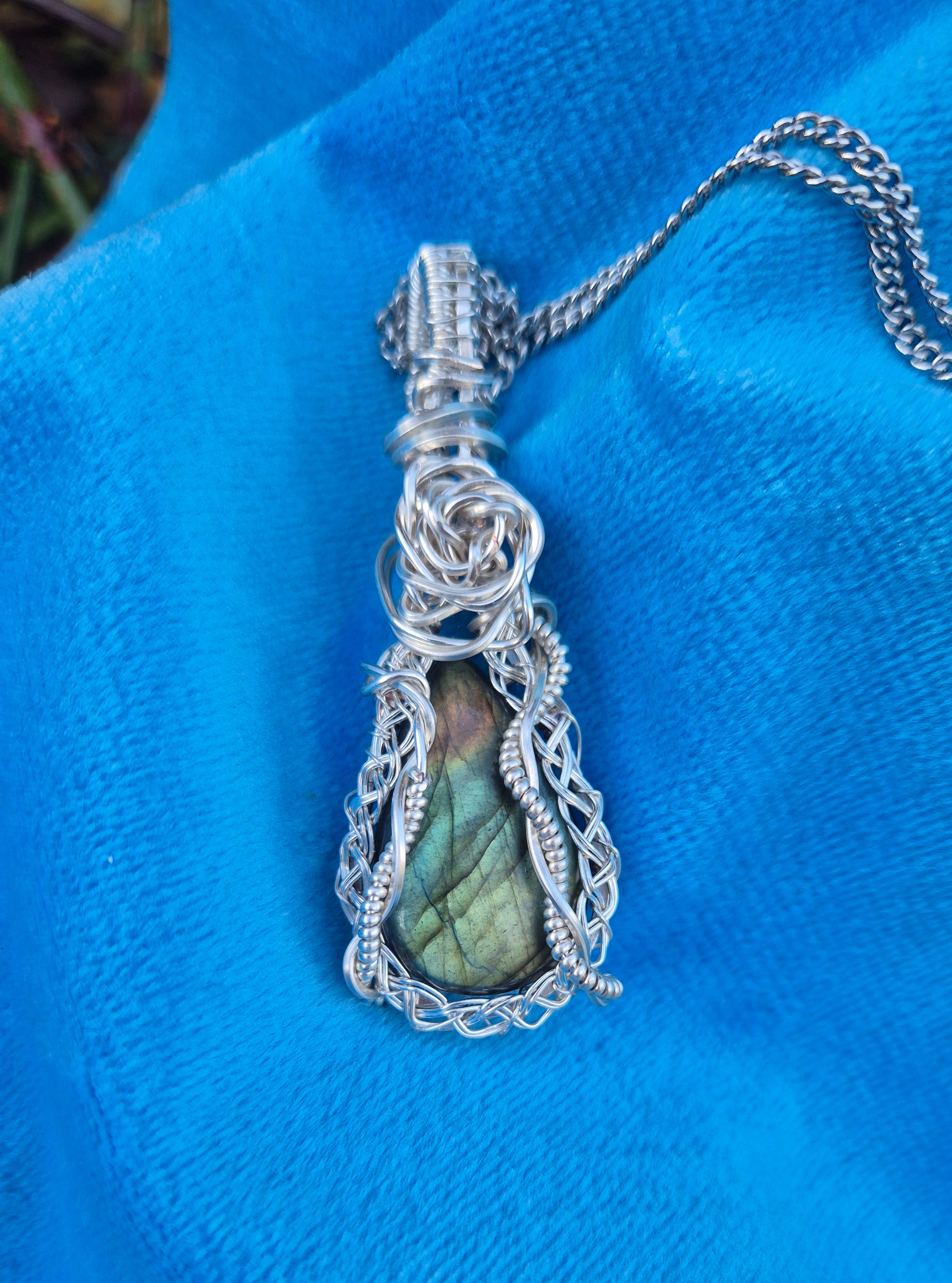 A luminous labradorite pendant wrapped in an intricate, hand-woven wire design — layered, sculptural, and rich in fine detail. The complex basket-style weave frames the stone like a protective cage, creating depth, texture, and an heirloom feel that sets this piece apart.