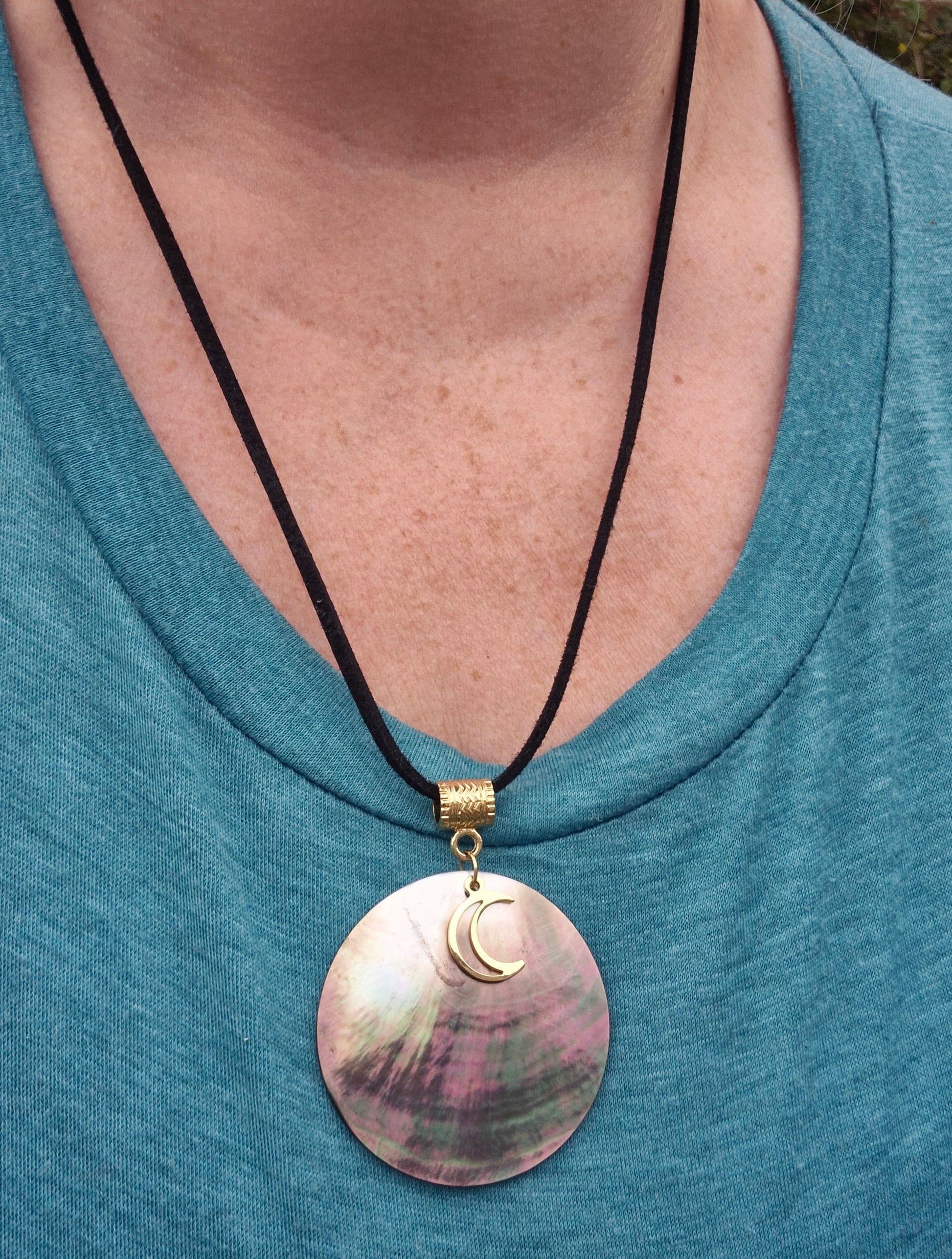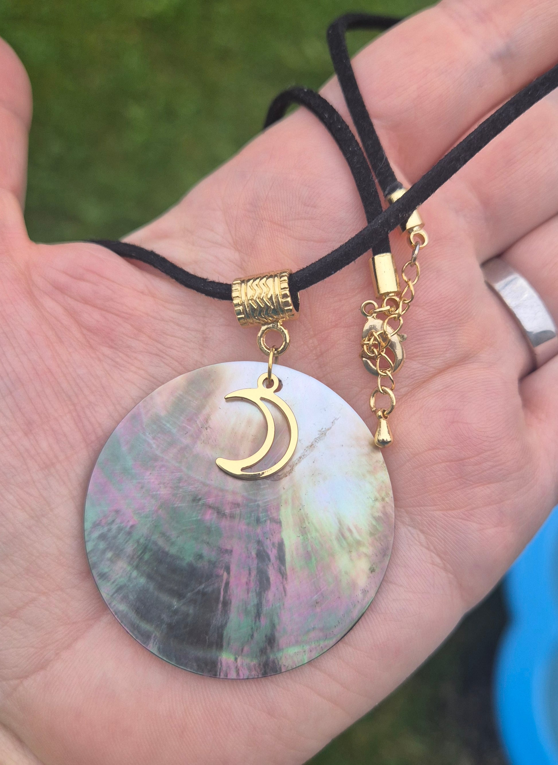 A delicate gold-filled crescent moon rests upon a shimmering disc of natural mother-of-pearl, reflecting soft tones of mauve, ivory, and green as the light shifts. Suspended from a supple black vegan suede cord, this piece blends earthy texture with refined mysticism.