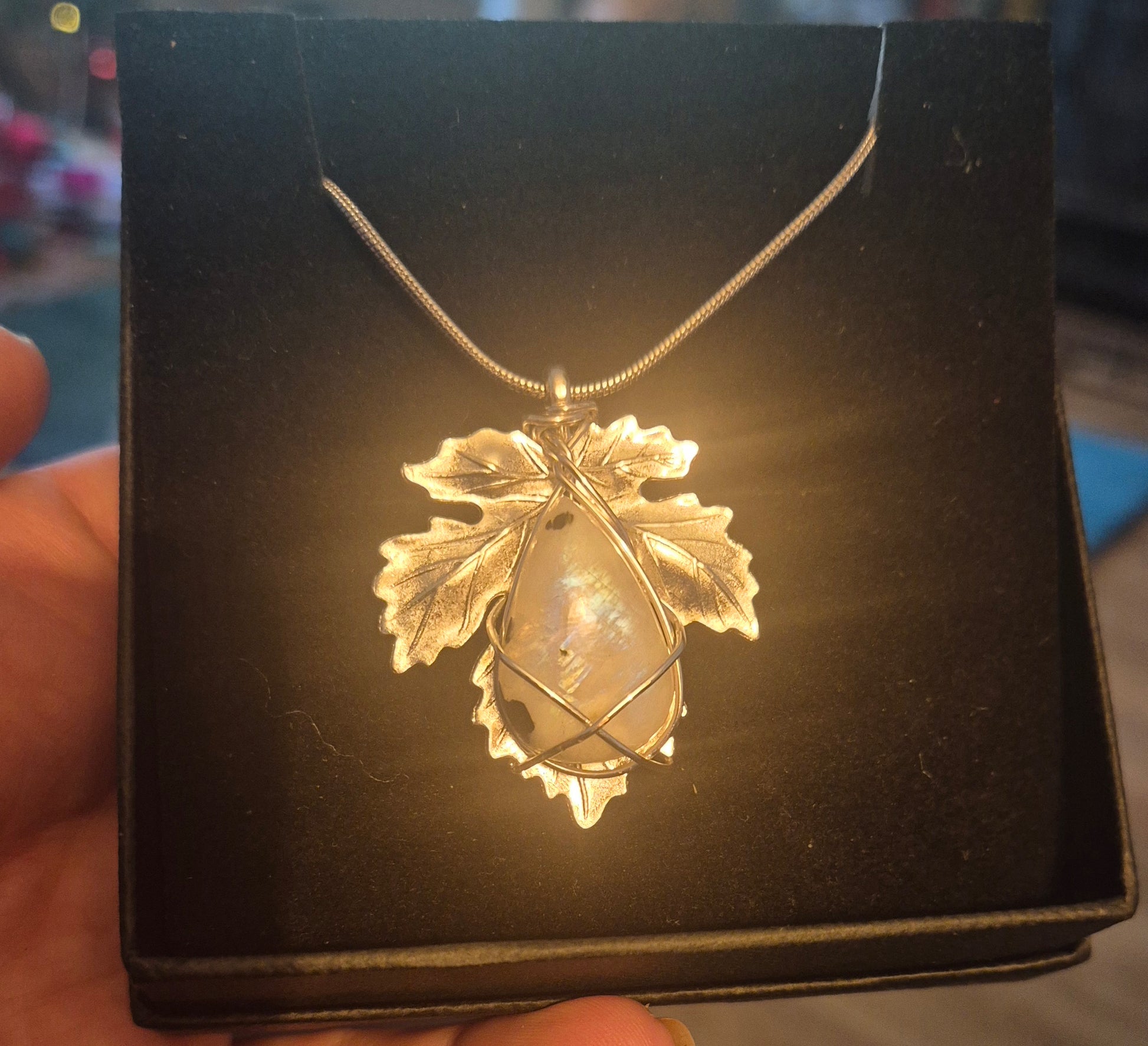 Evoke the spirit of the forest with this one-of-a-kind moonstone talisman, wrapped in silver tones and set against a sculpted leaf. This piece carries the soft shimmer of moonlight — that unmistakable blue flash only high-grade moonstone can deliver.