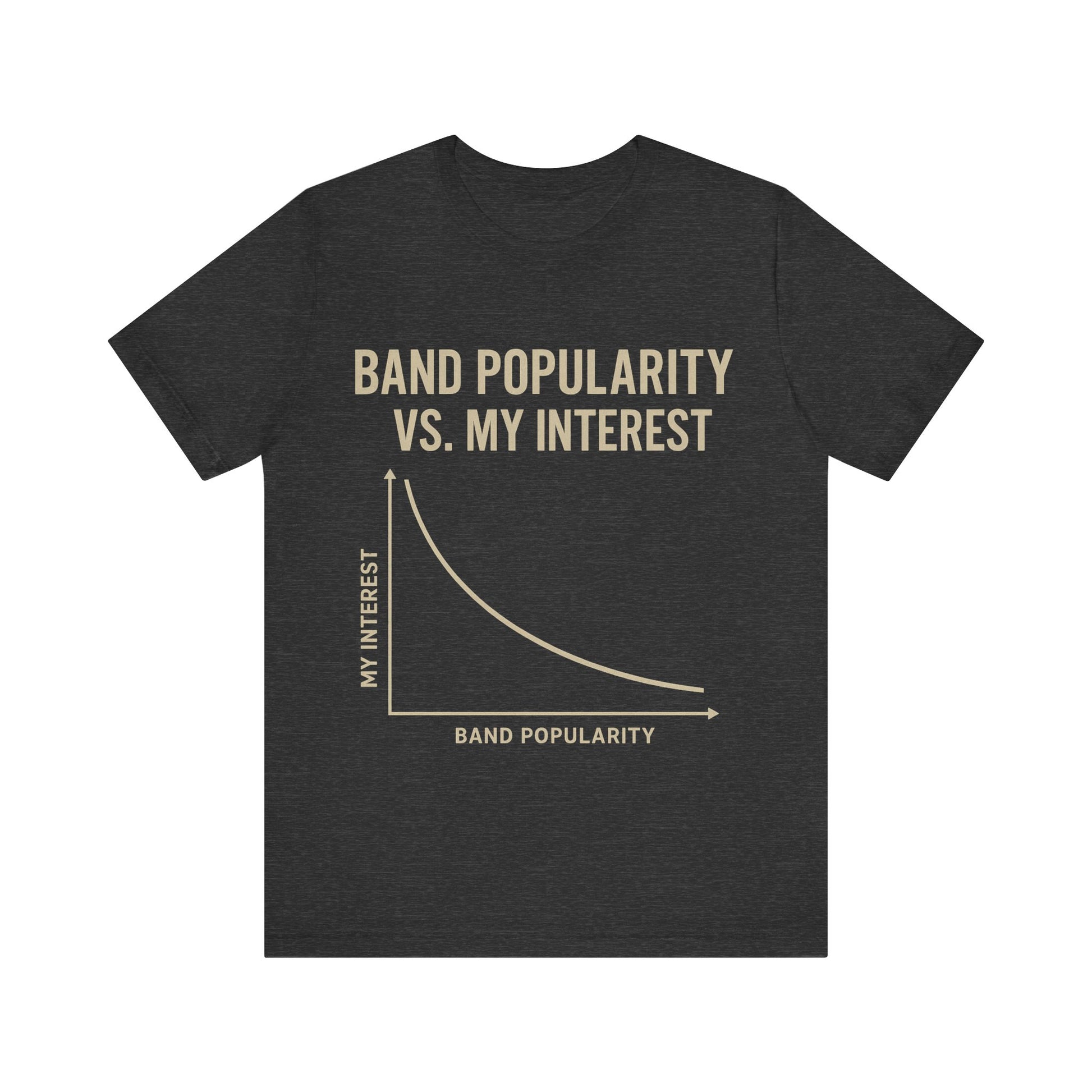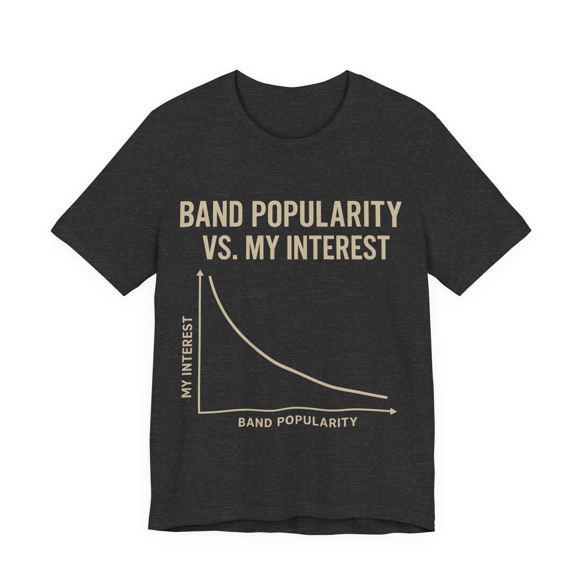 This clean, minimalist cream-on-black tee says what every record-store regular is thinking — the second a band gets popular, your interest falls faster than their artistic integrity.