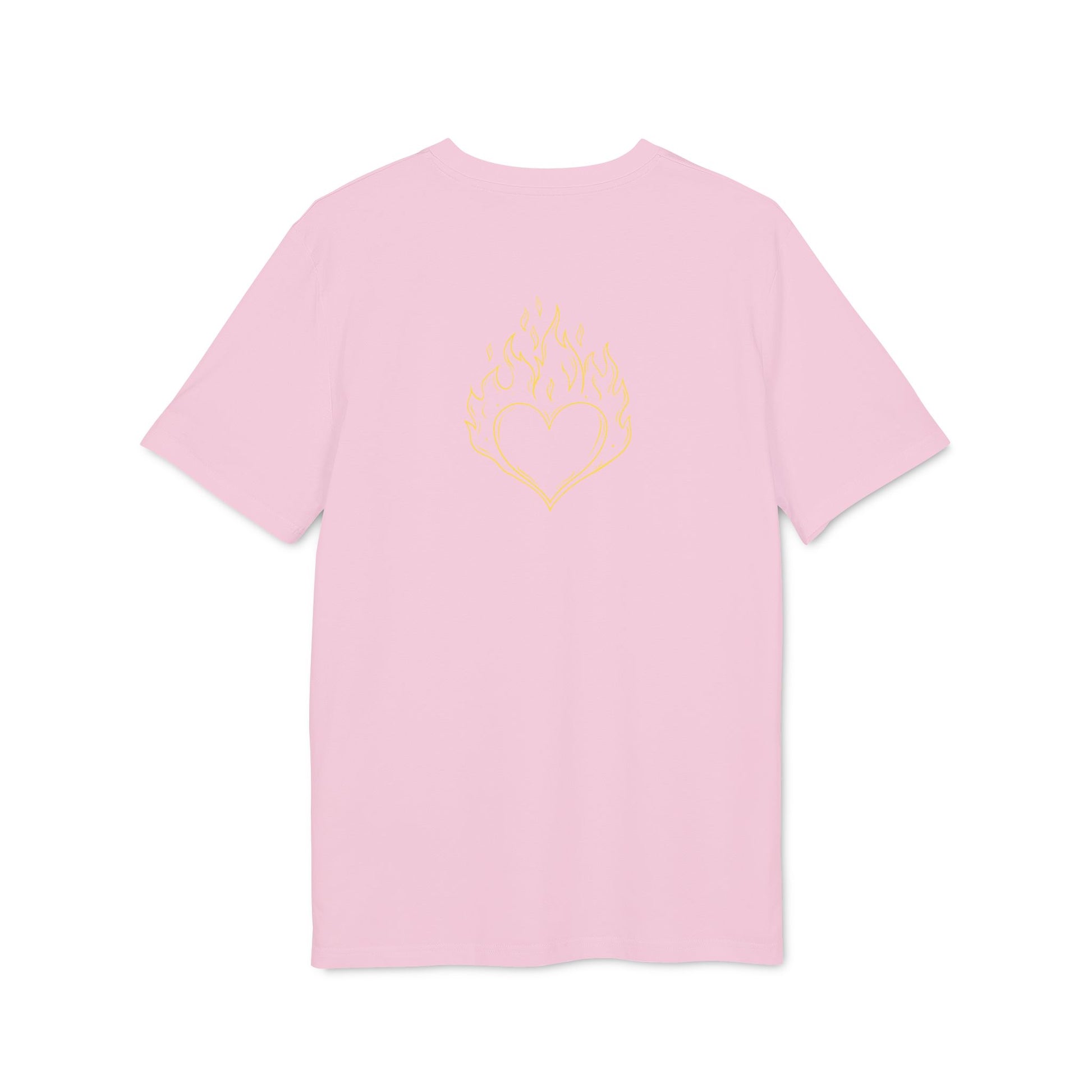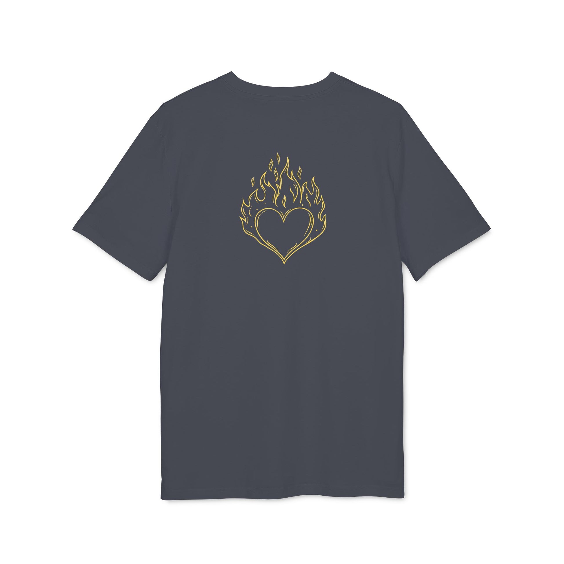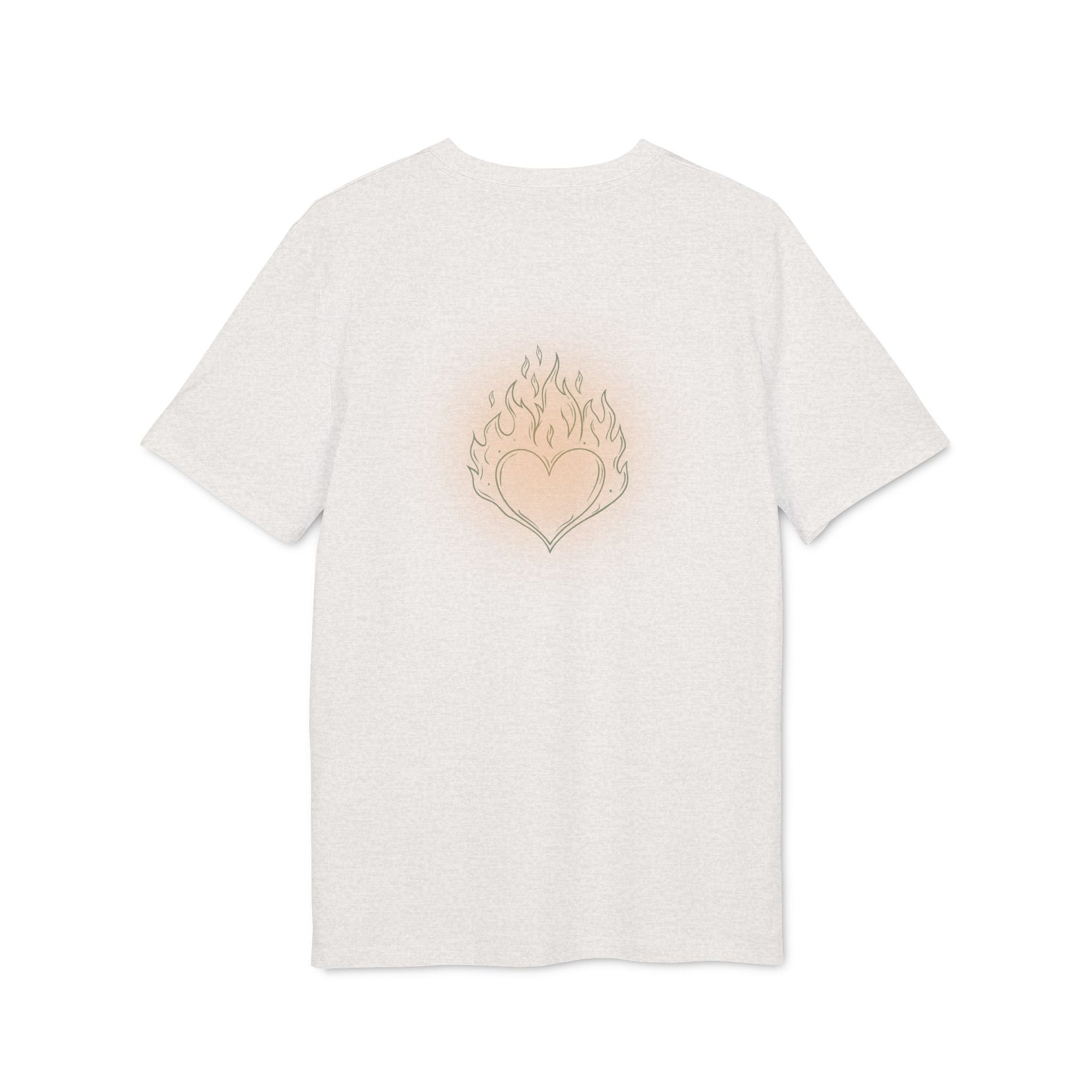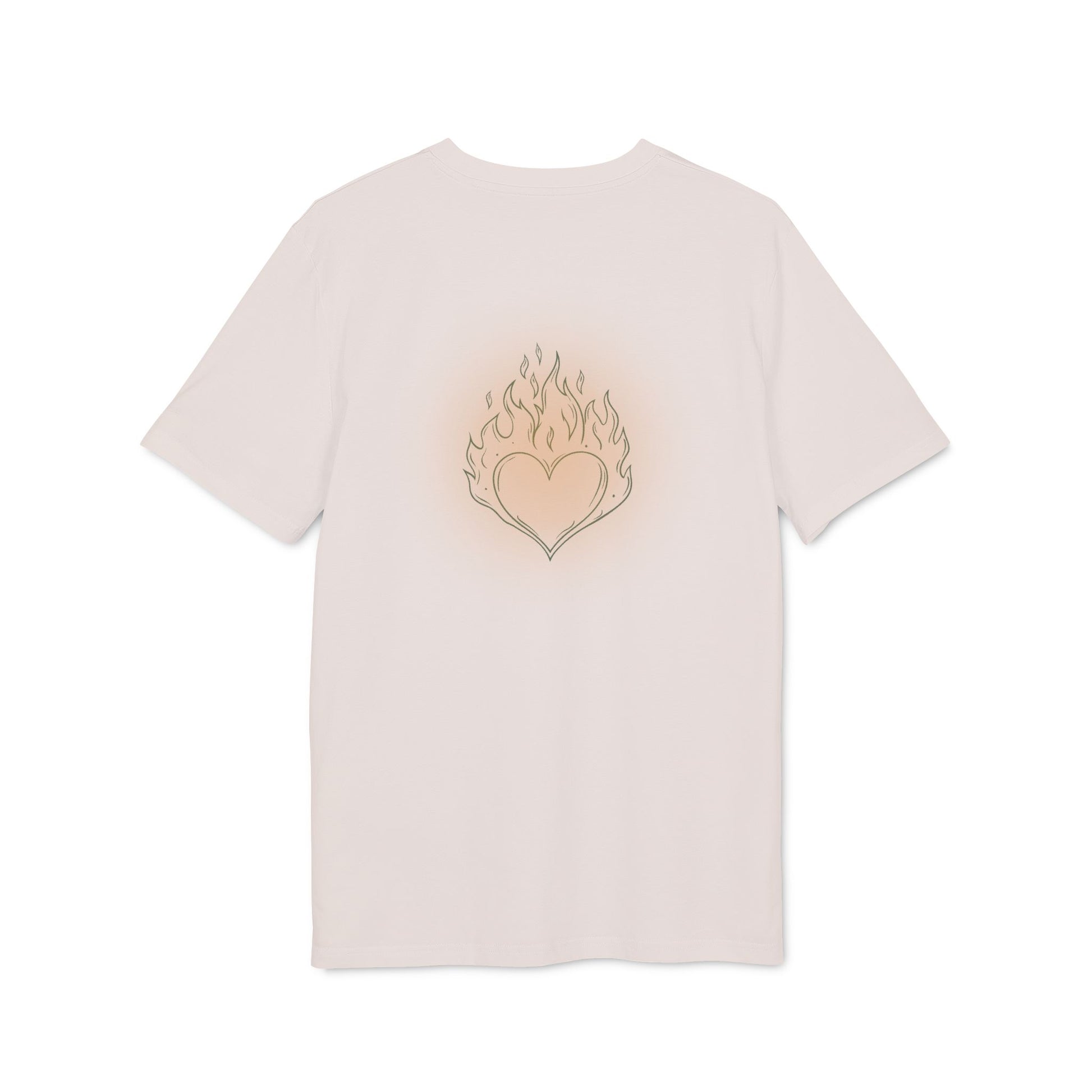 The front design features a majestic white stag with glowing antlers, a soaring hawk, and ethereal celestial accents, framed with ornate vines and a mystical flame. The back design shows a burning heart, a subtle nod to "Fireheart" the symbol of fire and resilience.