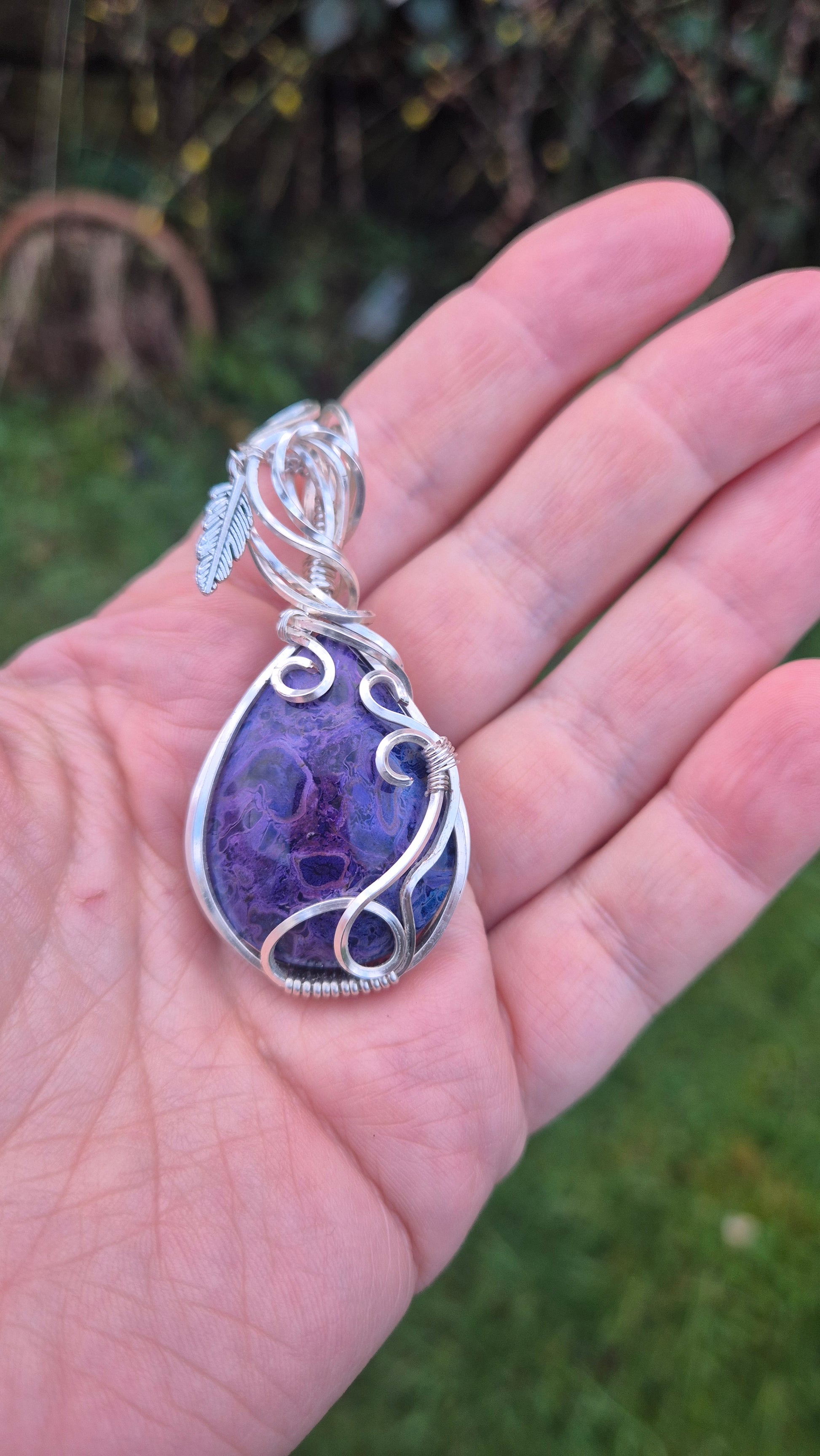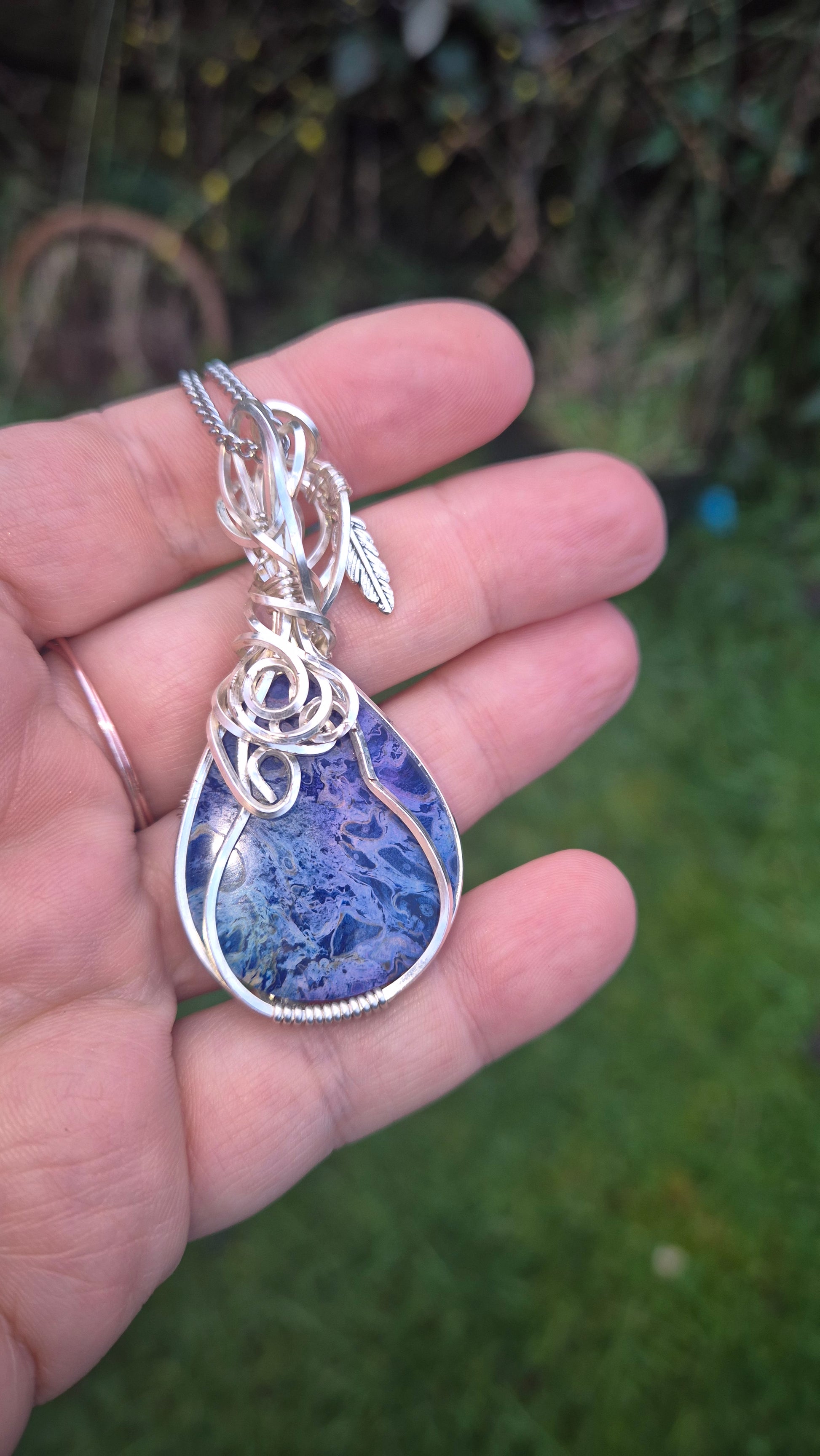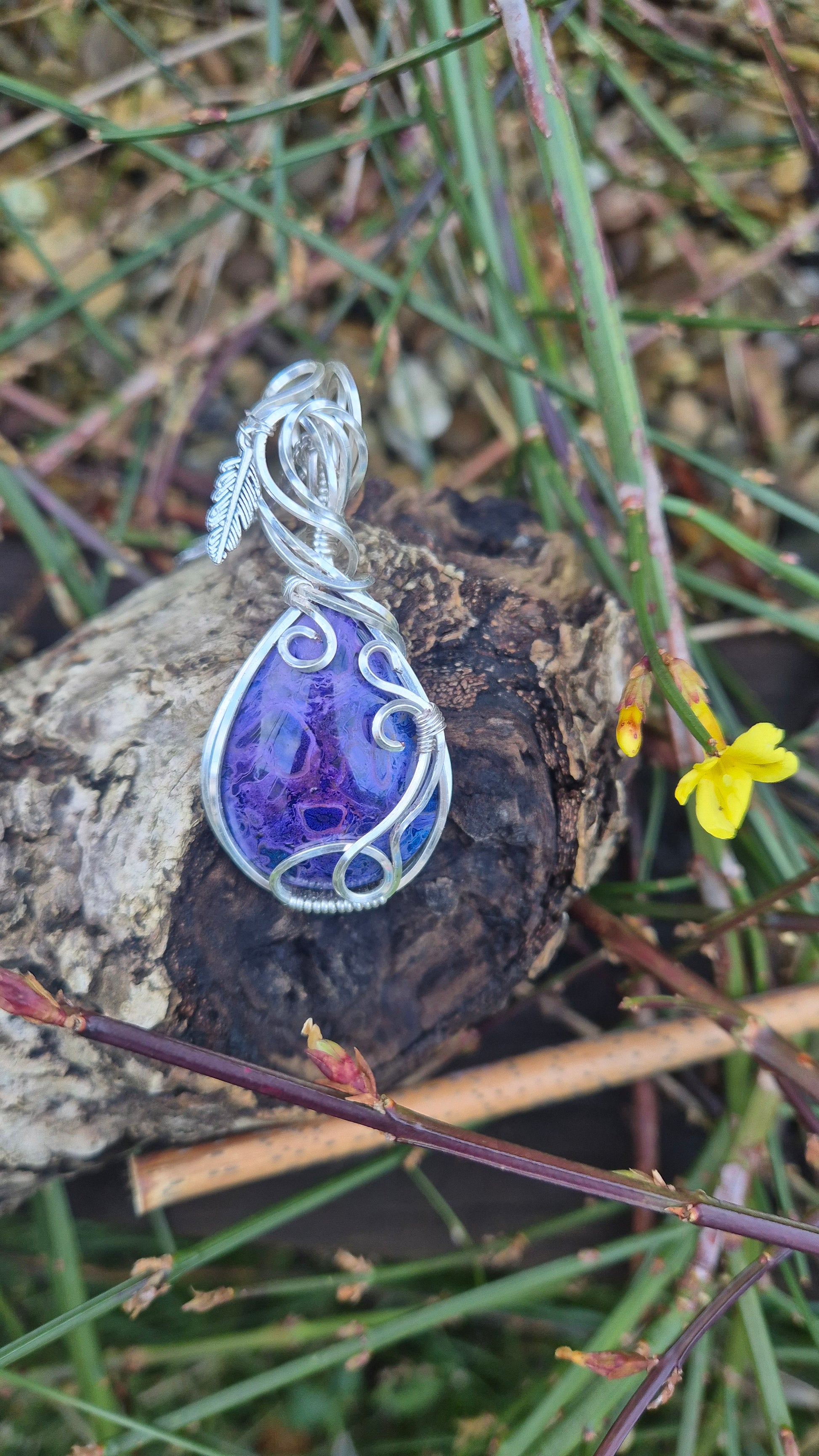 Hand-wrapped in flowing silver-plated wire with sculptural curls and finished with a delicate feather charm, the design blends organic texture with mystical, fantasy-inspired elegance. The natural grain of the palm root creates swirling, abstract patterns, ensuring every pendant is completely one of a kind.