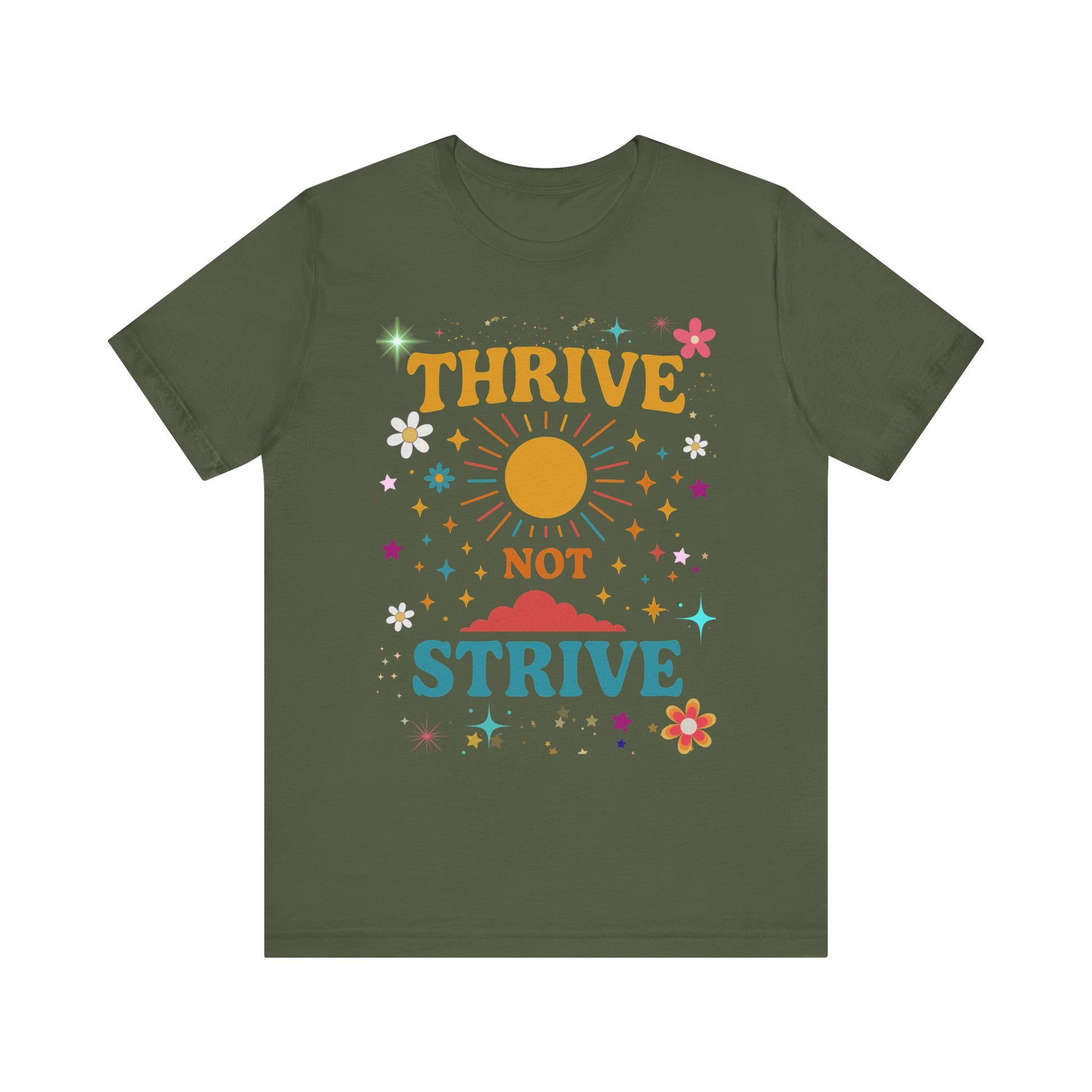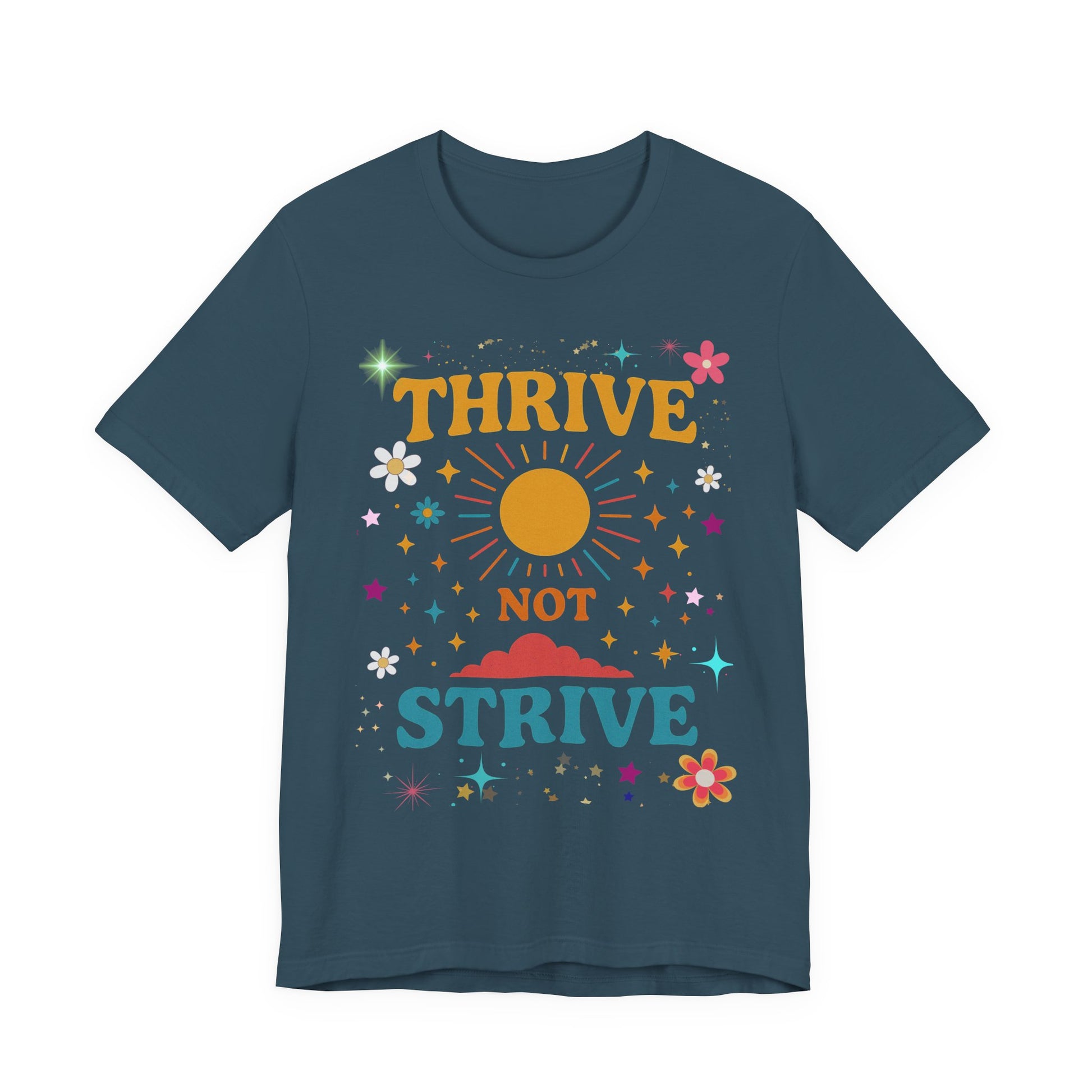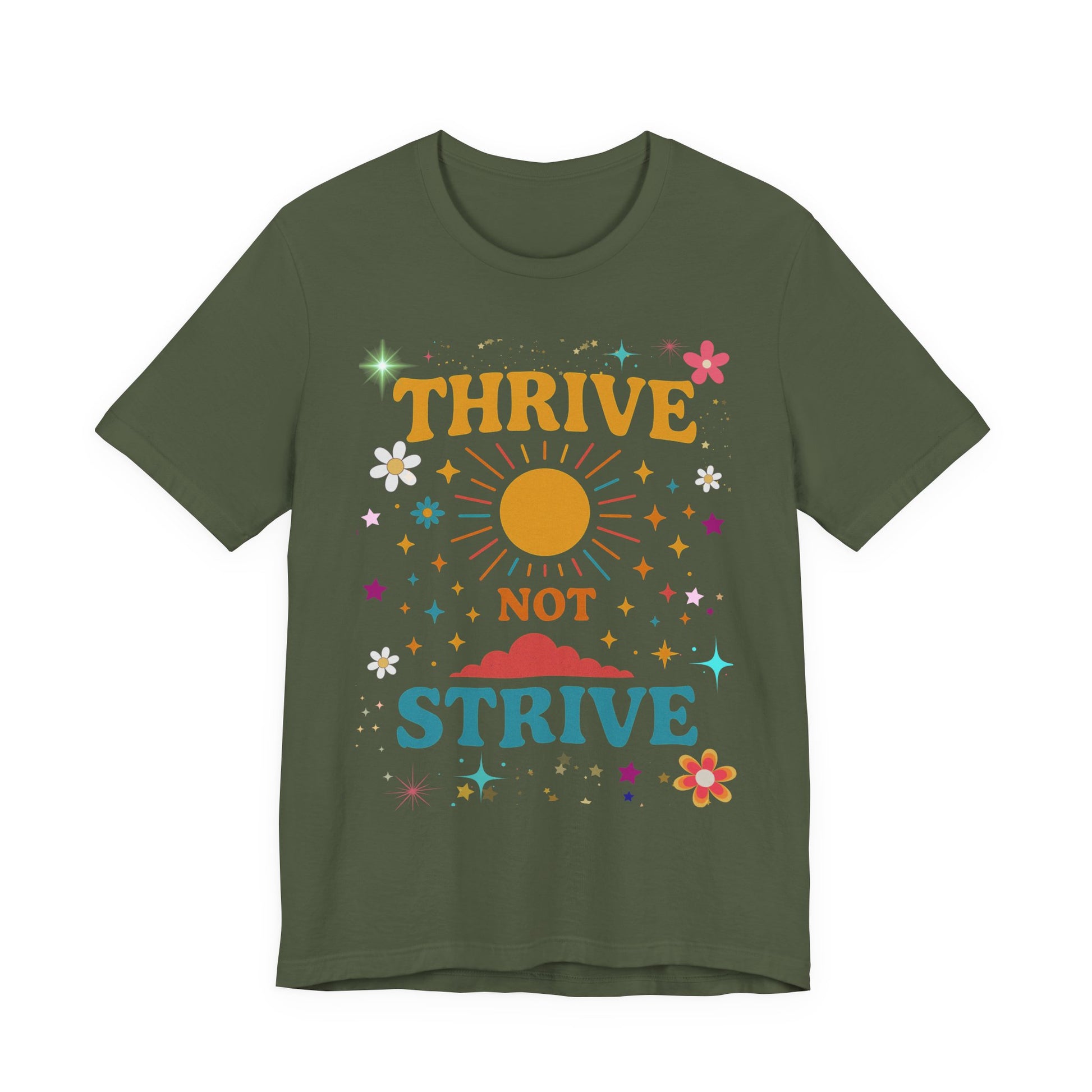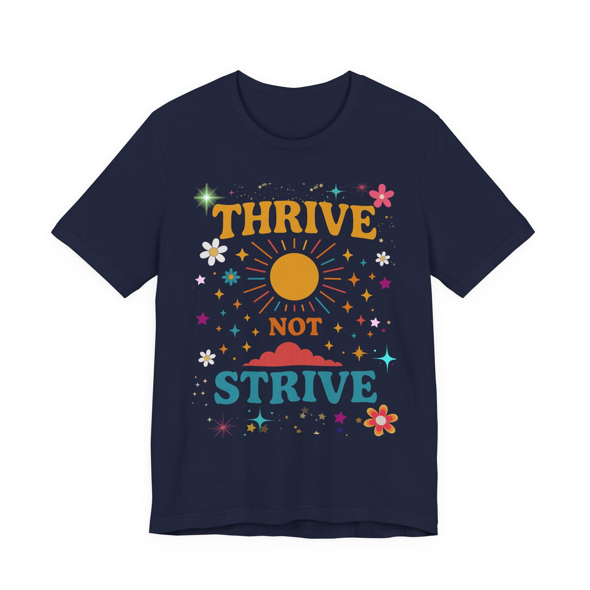 Embrace positivity with this stylish Unisex Jersey Short Sleeve Tee that radiates good vibes and encouragement. Featuring a colorful and uplifting 'Thrive Not Strive' design, this tee is perfect for anyone who believes in living life to the fullest.